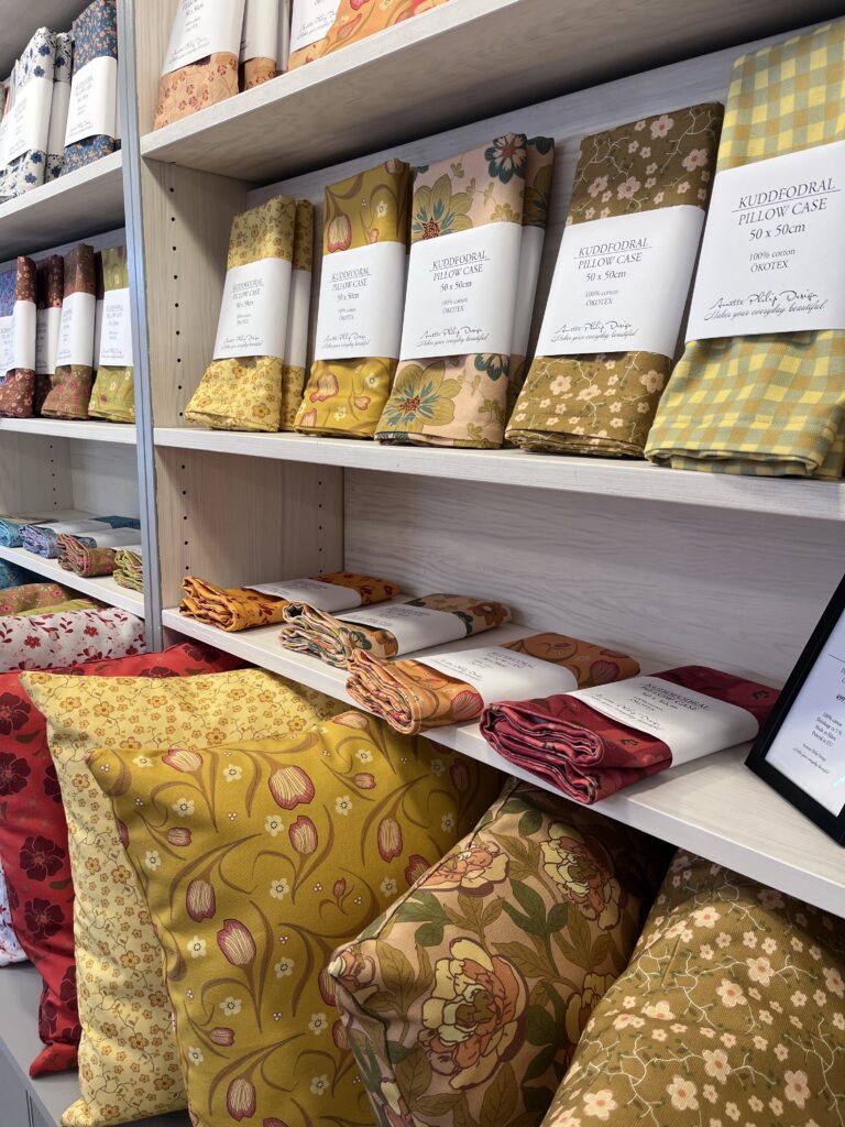 Vi har med oss många olika kuddfodral/kuddar färdiga för soffan. Köp även knappar som är klädda i våra tyger samt DIY-kit så du kan göra egna klädda knappar.